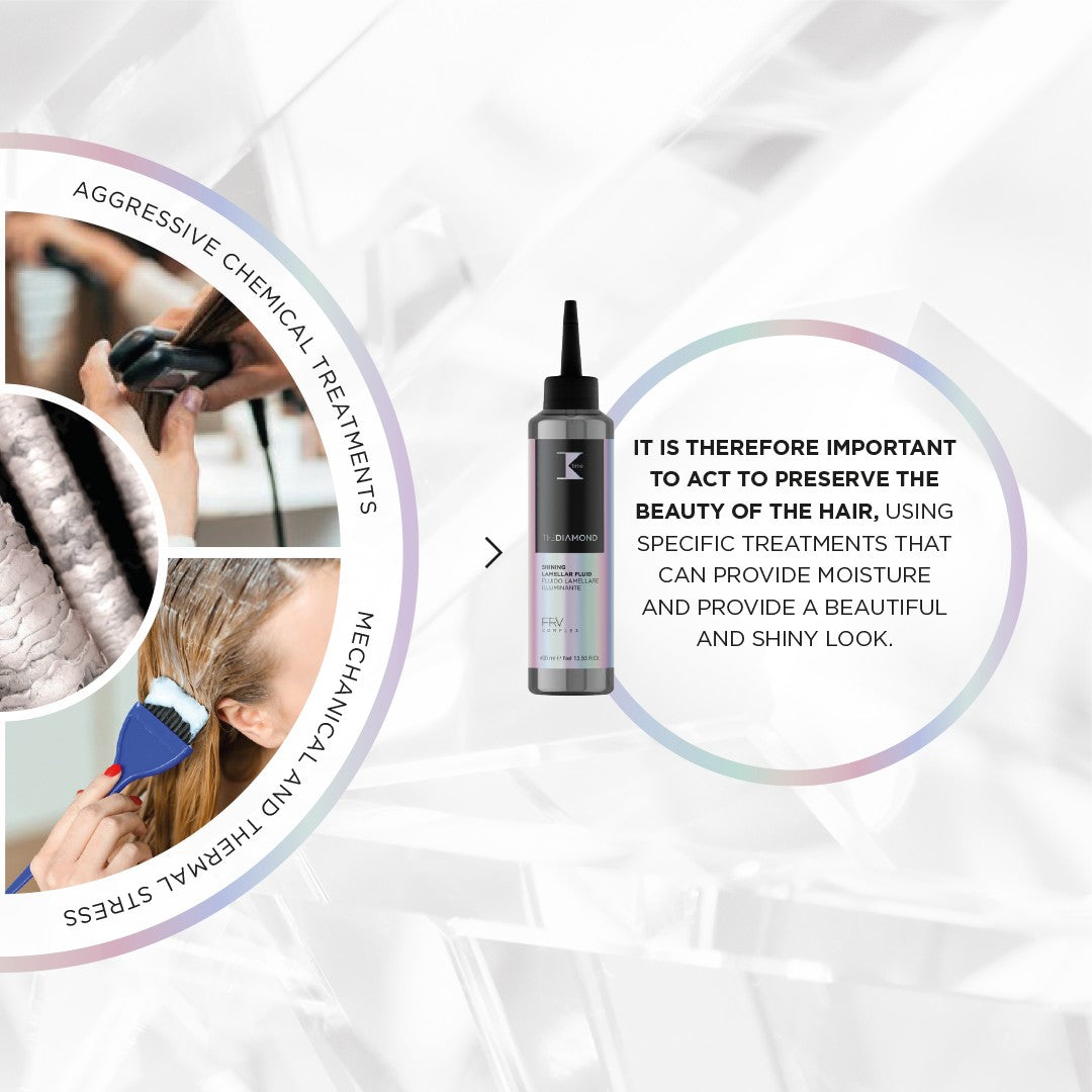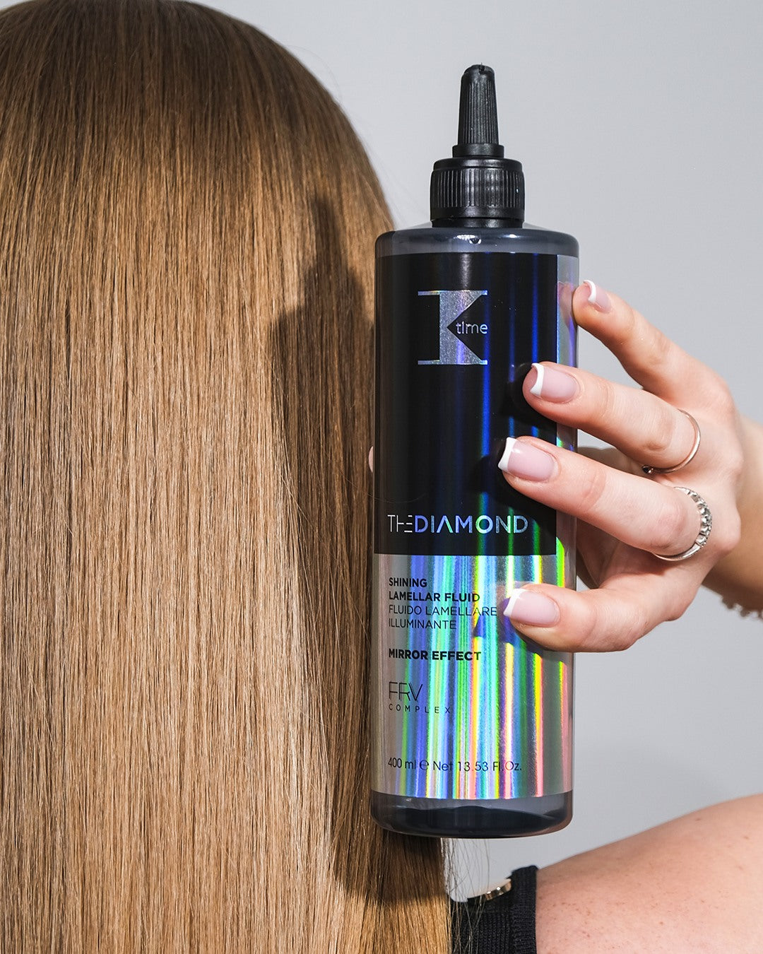 Thanks to its special fluid texture, The Diamond illuminating lamellar conditioner moisturises and smooths the hair, creating an incredibly shiny mirror effect in just 9 seconds.